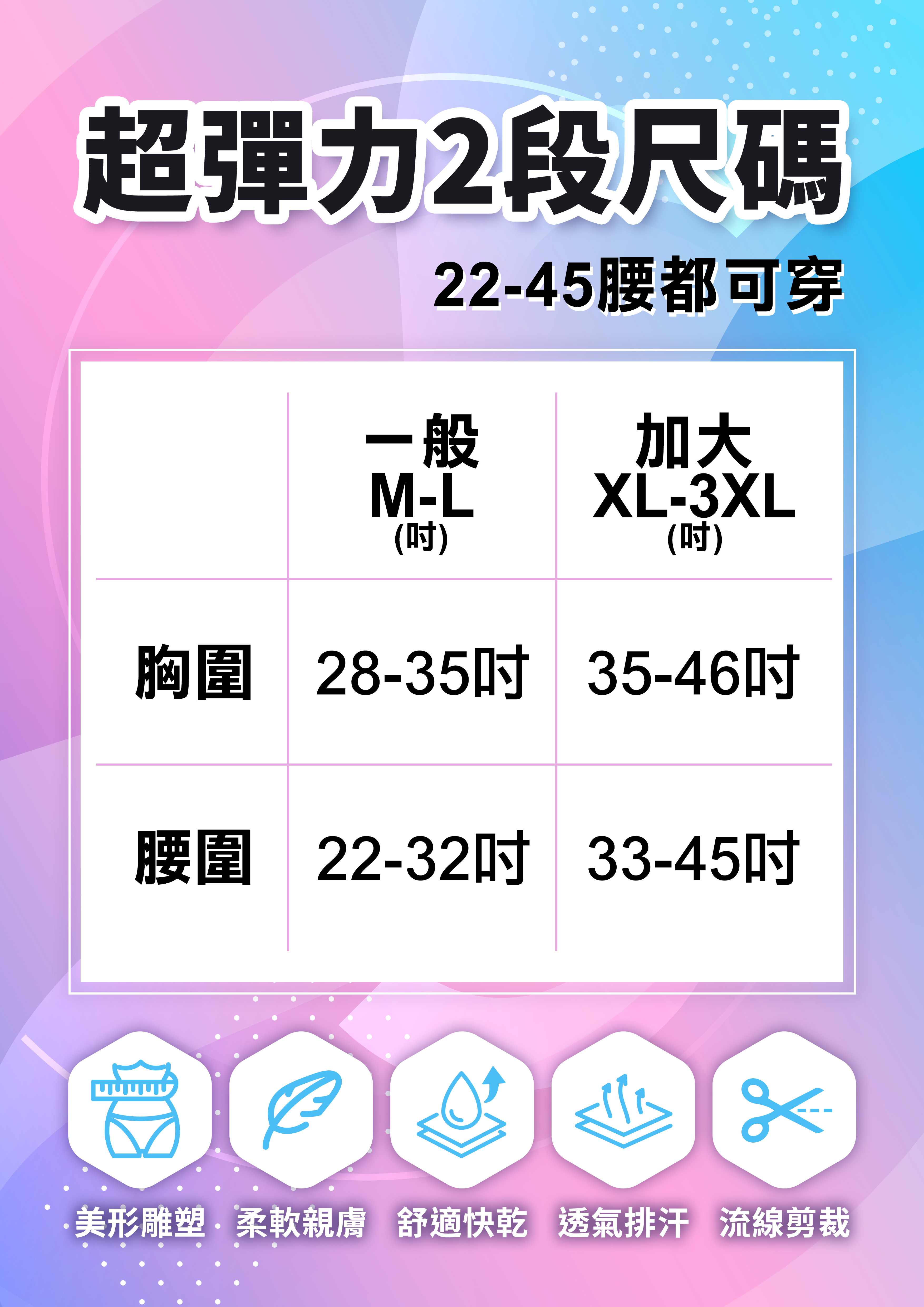 尺寸:M-L (胸圍28-35吋/腰圍22-32吋) /XL-3XL (胸圍35-46吋/腰圍33-45吋)