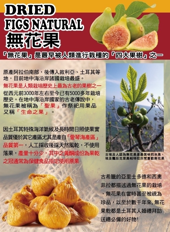 1. 特選完熟完整果粒無花果,不經榨汁,天然日曬風乾而成.