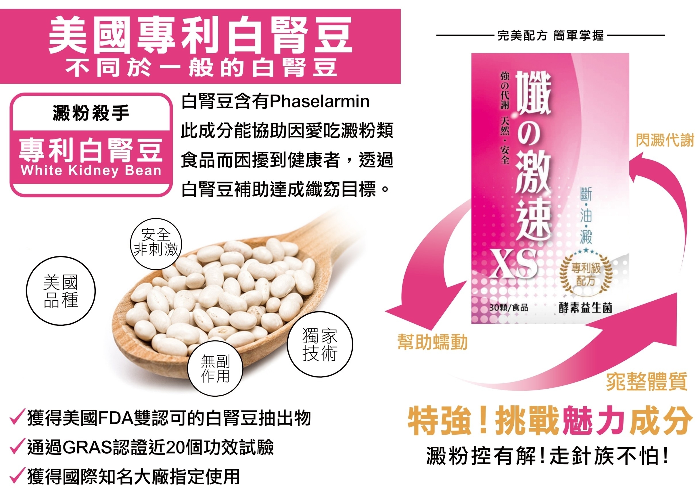 成分:天然綜合分解酵素、澱粉分解酵素、白腎豆萃取物、專利藤黃果萃取物、專利益生菌粉(二十益菌)(麥牙糊精、植物乳桿菌、動物雙歧桿菌、長雙歧桿菌嬰兒亞種、嗜酸乳桿菌、羅伊氏乳桿菌、鼠李糖乳桿菌、乾酪乳桿菌、副乾酪乳桿菌、唾液乳桿菌、短雙歧桿菌、兩歧雙歧桿菌、瑞士乳桿菌、發酵乳桿菌、約氏乳桿菌、加氏乳桿菌、長雙歧桿菌長亞種、保加利亞桿菌)、金針菇萃取物、專利啤酒酵母萃取物、綠咖啡萃取物(綠原酸)、專利黑蒜萃取物、非洲芒果萃取物、專利毛喉鞘蕊花萃取物、海洋鎂、石決明萃取物