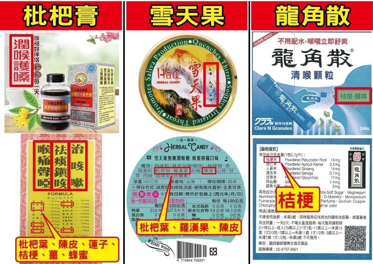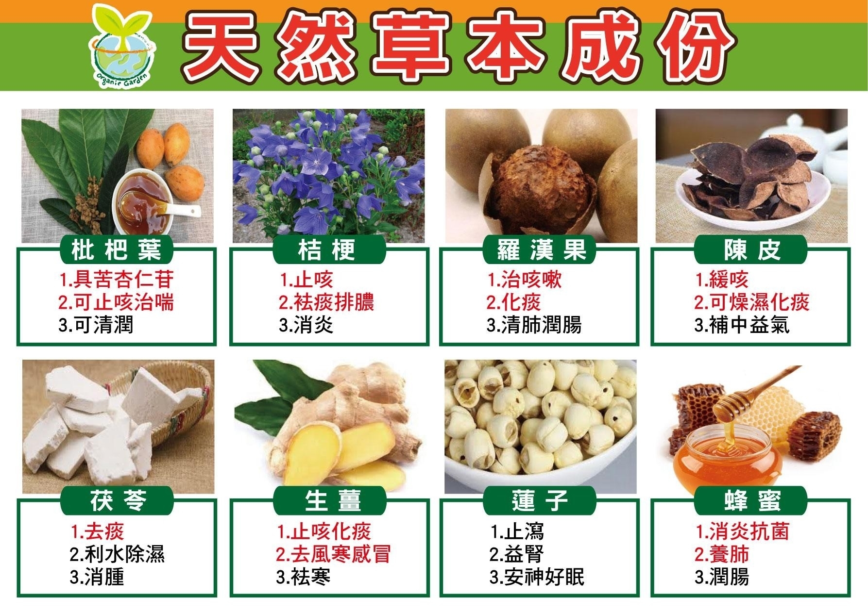 成份:砂糖、麥芽糖、椰子油、阿拉伯膠、植物萃取物(枇杷葉、桔梗、茯苓、陳皮、蓮子、羅漢果、生薑)、蜂蜜、薄荷、香料、食用色素(焦糖色素)、棕櫚蠟(食品製造用劑)